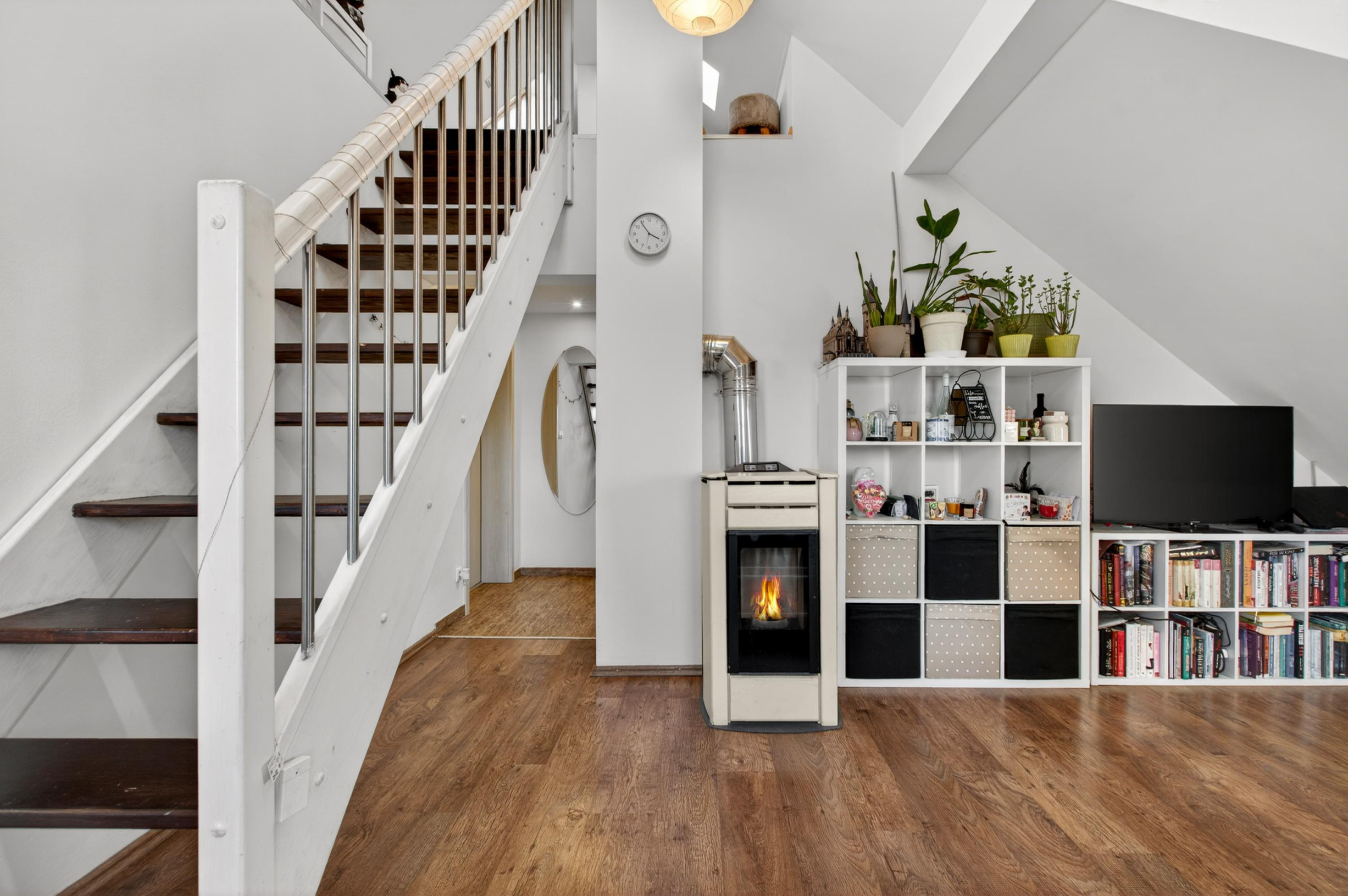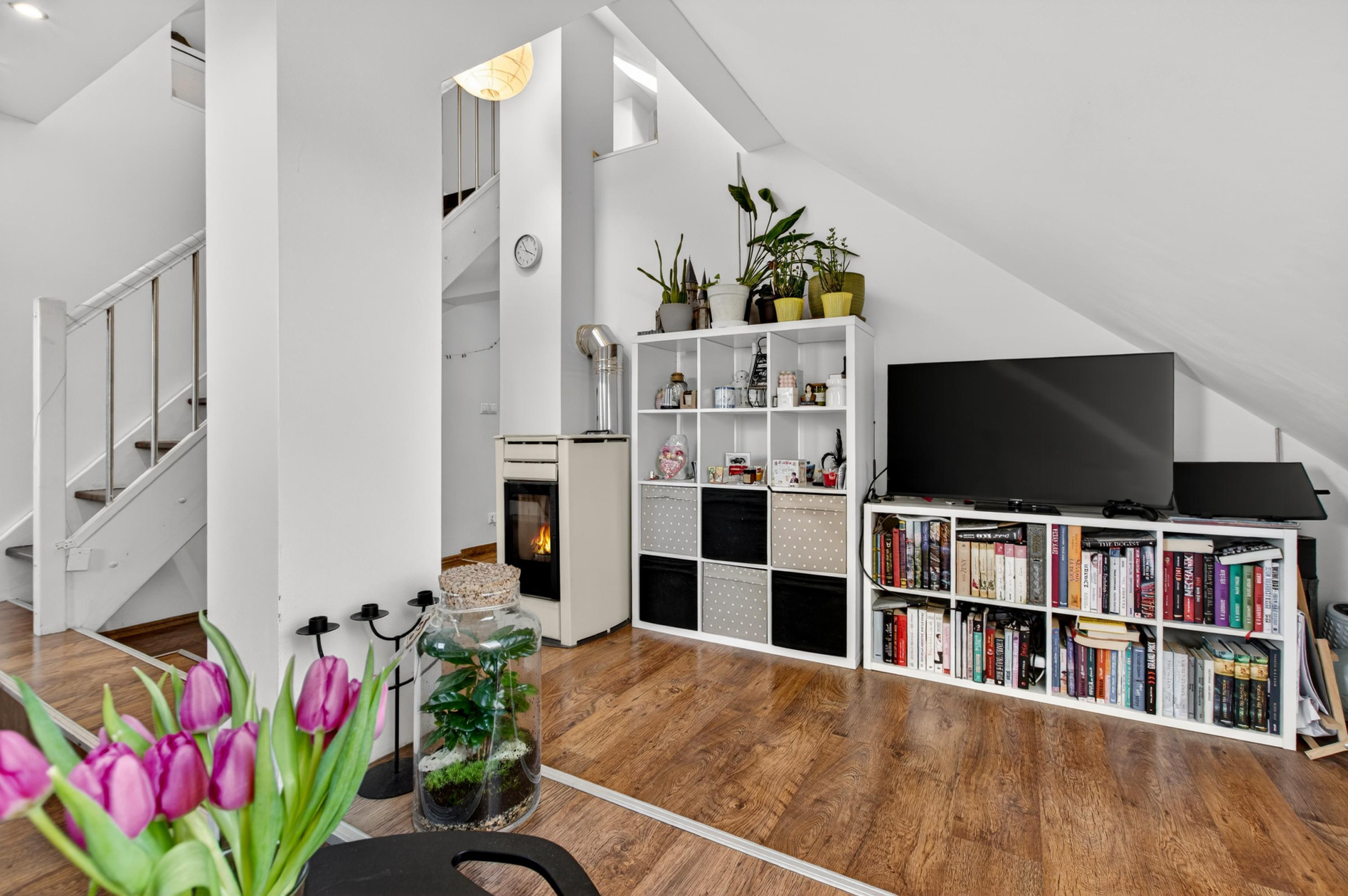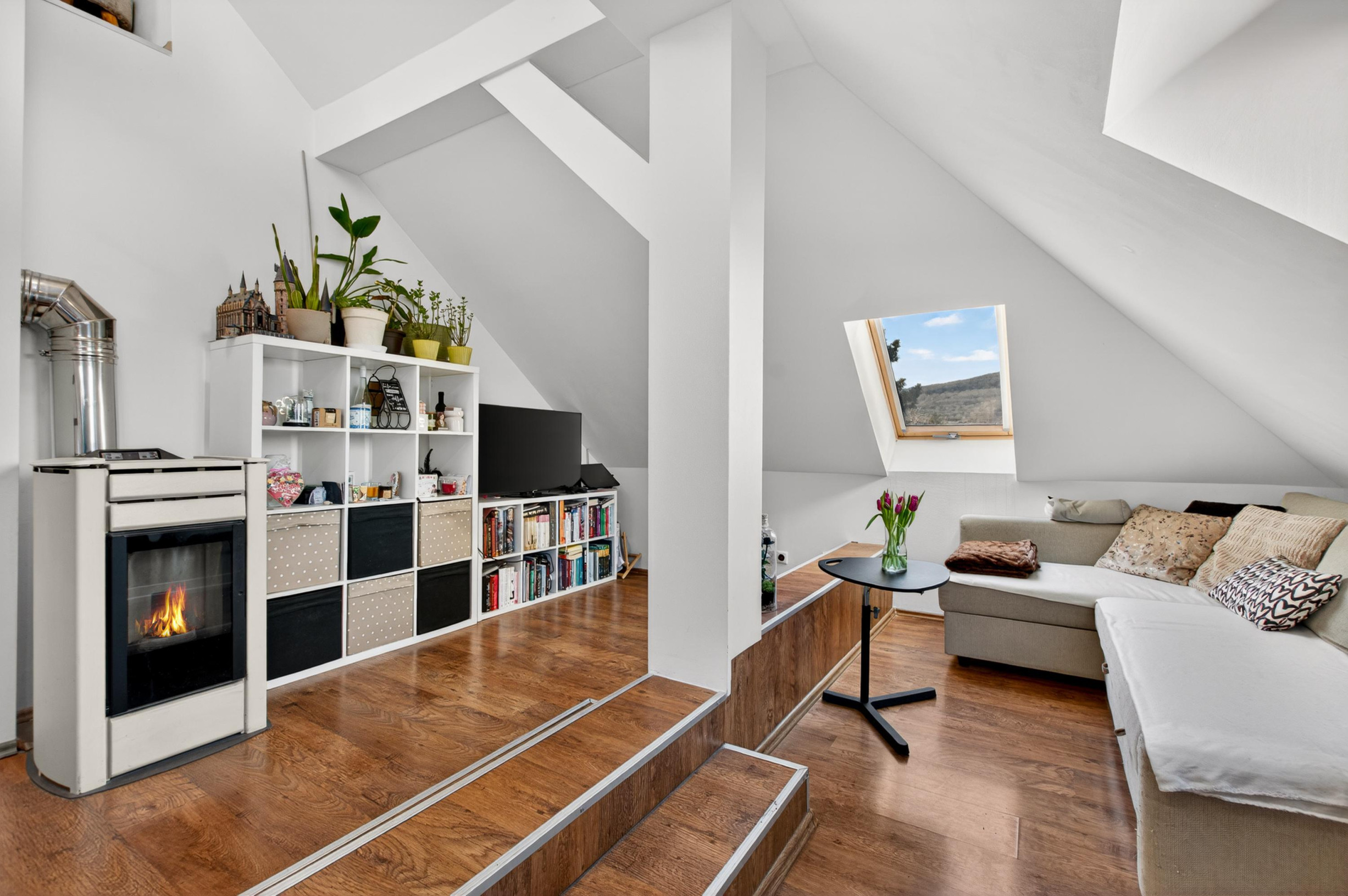 Kachle v obývačke – teplo a pocit domova, ktorý sa nedá kúpiť v katalógu. Šikmé stropy a viditeľné trámy – typická podkrovná romantika, ktorá dáva bytu charakter.