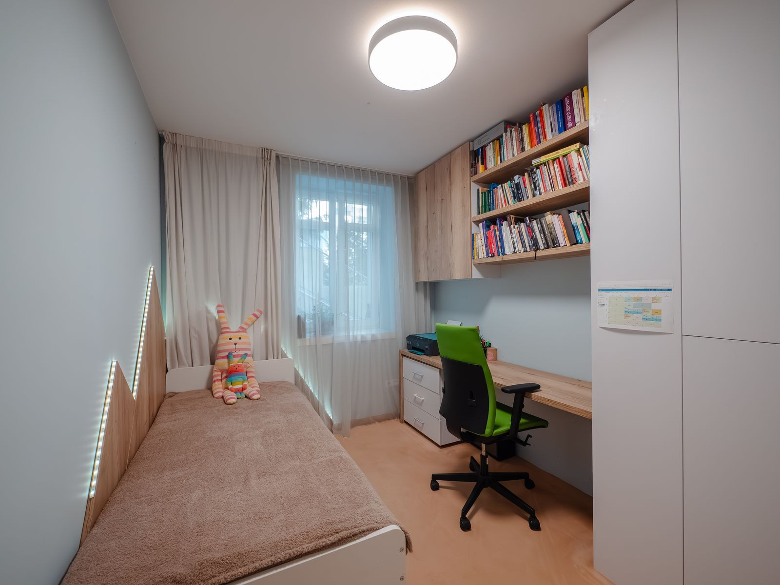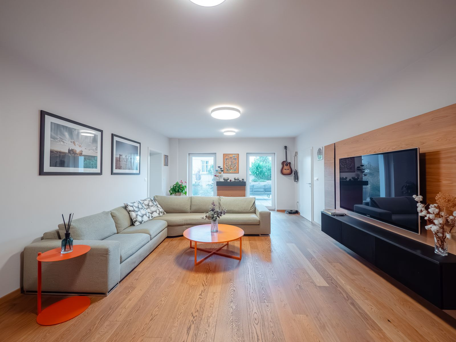vstupná hala, obývacia izba prepojená s kuchyňou a jedálenskou časťou, hlavná spálňa, detská izba / pracovňa, šatník, kúpeľňa s WC + technická miestnosť (práčovňa/sušiareň s prípravou na saunu), samostatné hosťovské WC, terasa prístupná z obývačky, spálne aj chodby. Možnosť prestrešenia časti terasy a vytvorenia zimnej záhrady, čím je možné predĺžené užívanie exteriéru aj v nepriaznivom počasí.